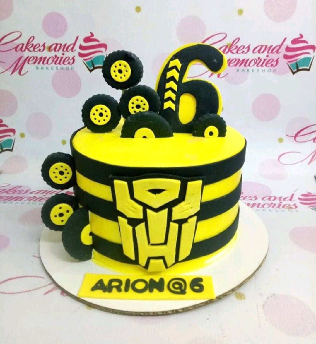 Yellow and black Transformers Bumblebee themed cake with fondant tires and a large number six topper.