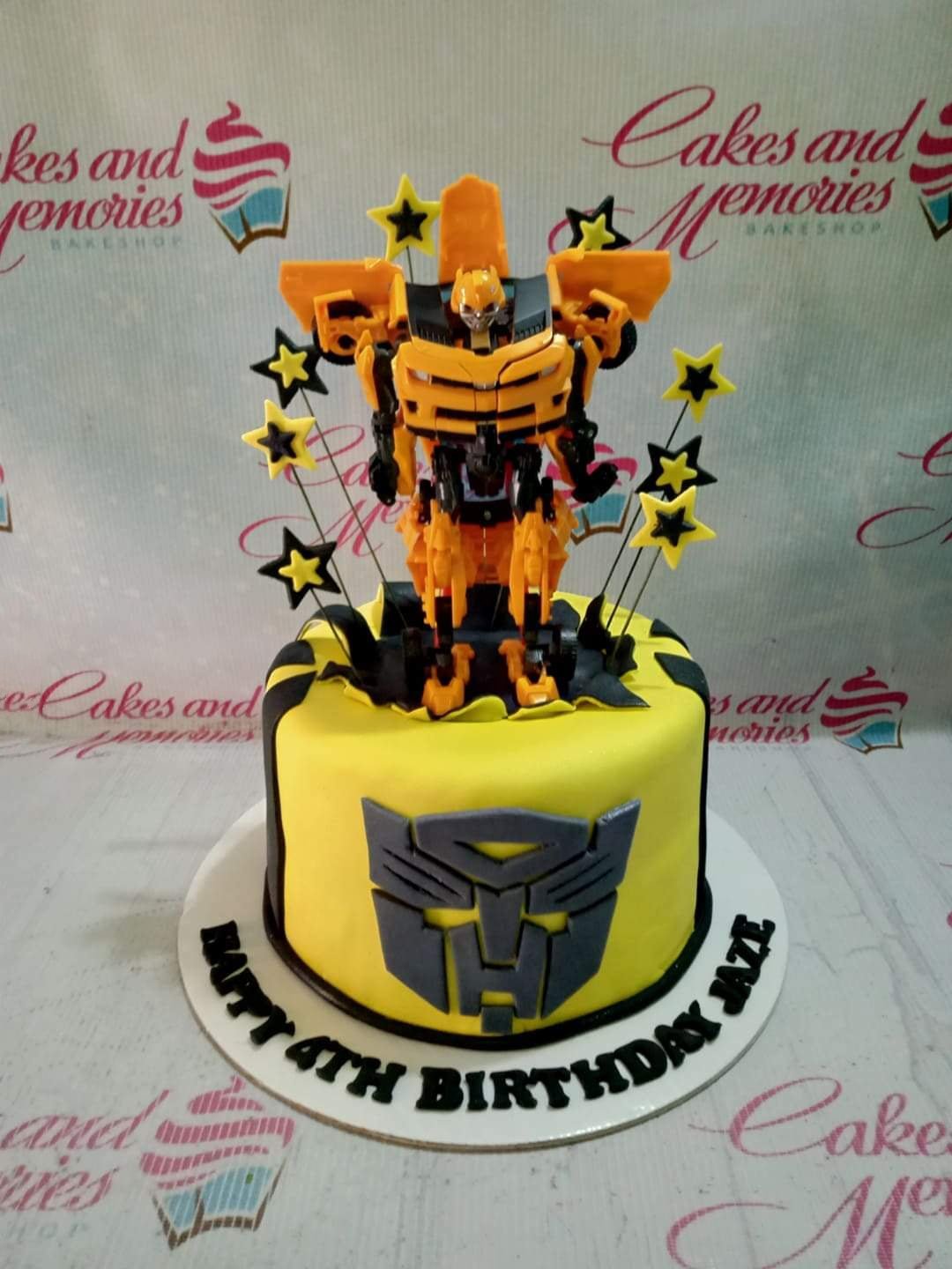 Yellow and black Transformers Bumblebee themed birthday cake with a large robot toy topper and Autobot logo.