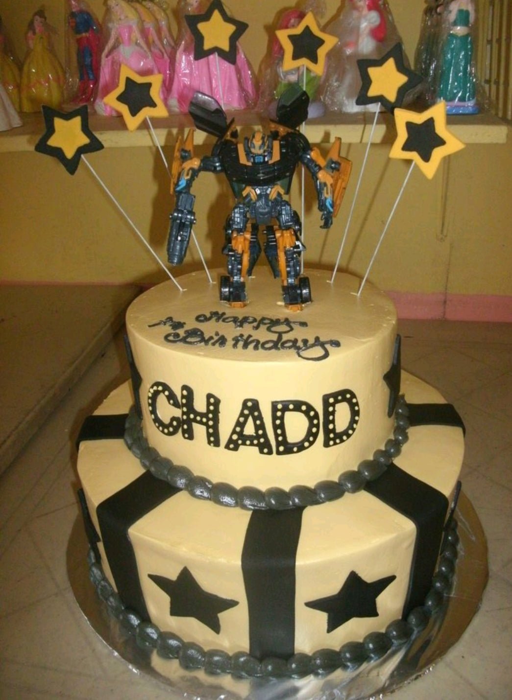 Two-tier Transformers Bumblebee themed birthday cake in yellow and black with star toppers and a robot toy.