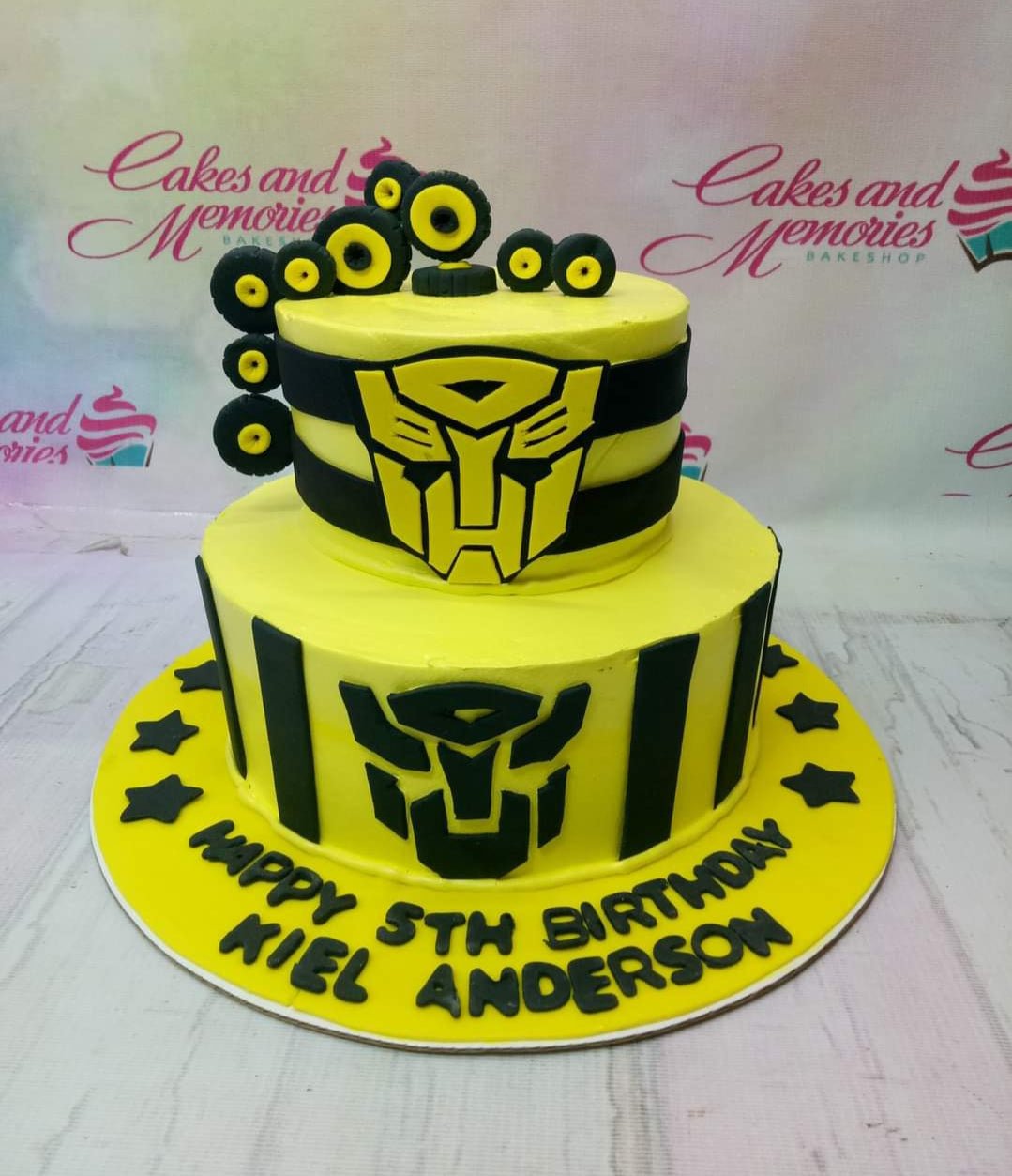 Yellow and black 2-tier Transformers Bumblebee themed cake with tire toppers and Autobot logos.