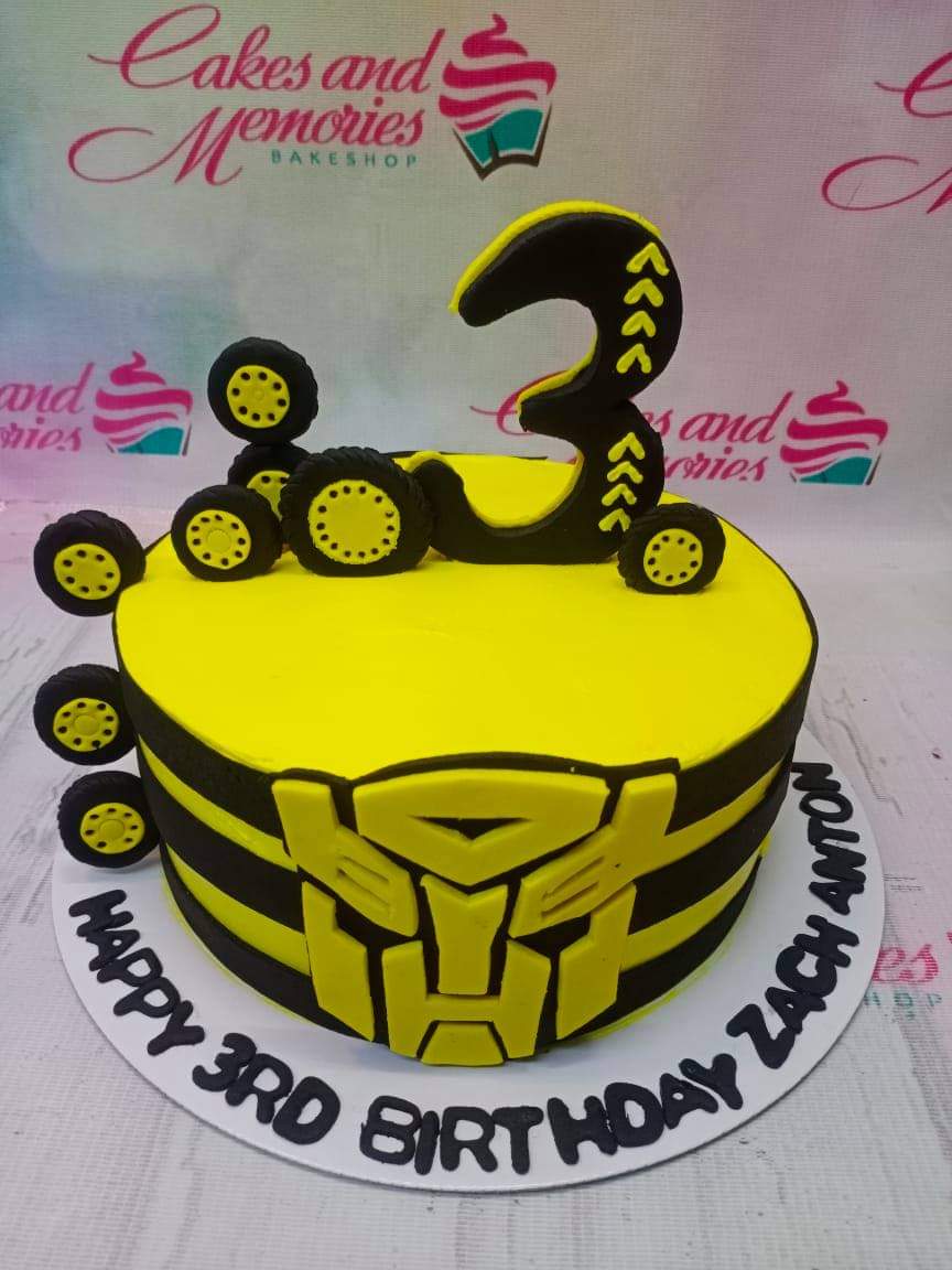 Yellow and black Transformers themed birthday cake with a large number 3 topper and tire decorations.