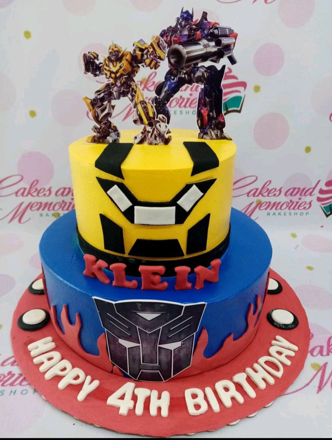 Two-tier Transformers themed cake with Bumblebee and Optimus Prime toppers, blue and yellow fondant, and red gumpaste letters.