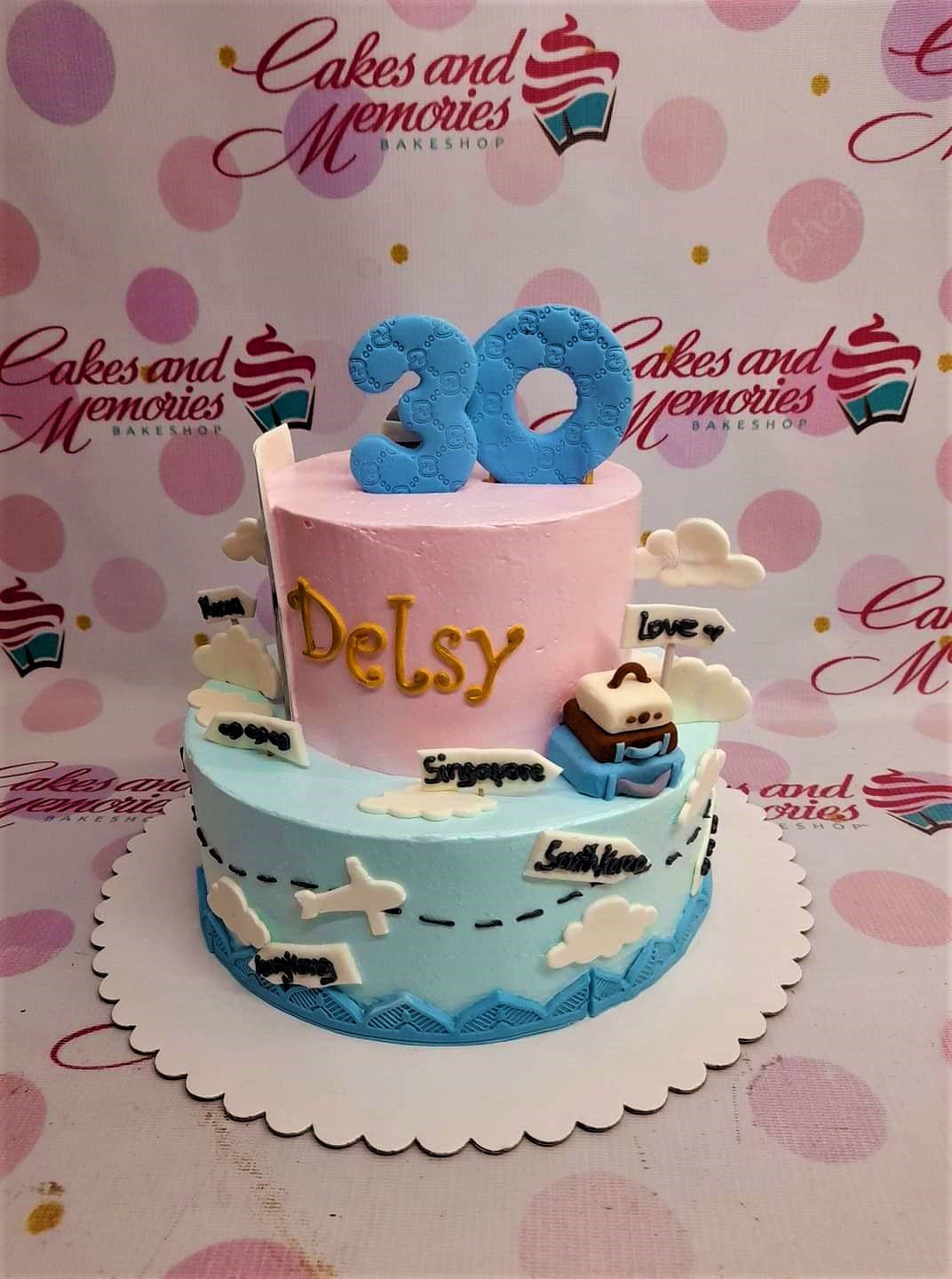 Two-tier travel themed cake with pink and light blue fondant, featuring a 3D number 30, suitcases, and destination signs.