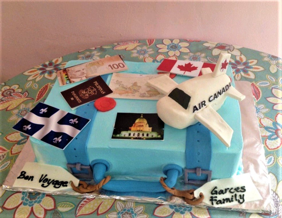 Light blue square suitcase cake with a 3D Air Canada plane, Canadian flag, passport, and travel-themed printouts.