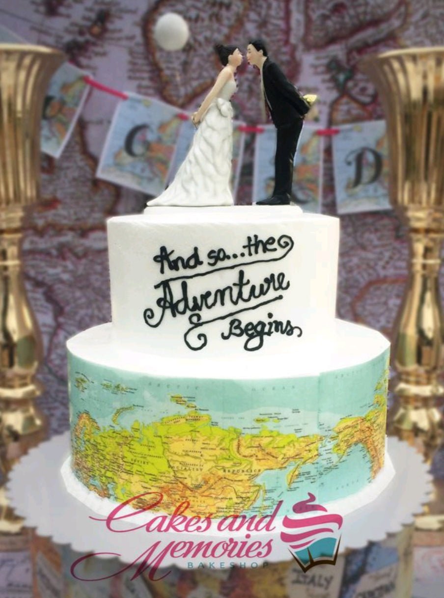 Two-tier white wedding cake with a world map wrap on the bottom tier and a bride and groom topper on top.