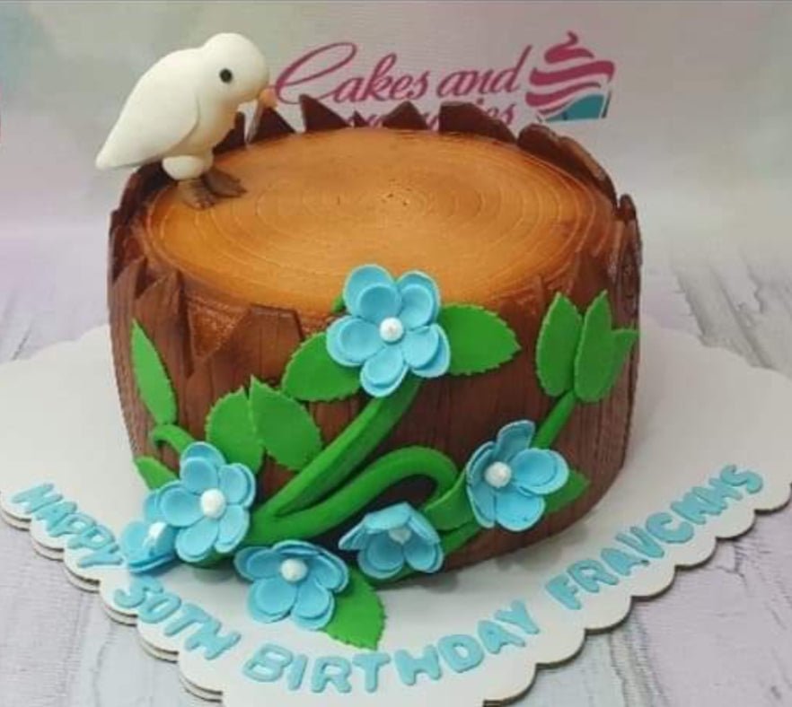 A tree stump cake with a white bird topper, blue fondant flowers, and green leaves on a white scalloped board.