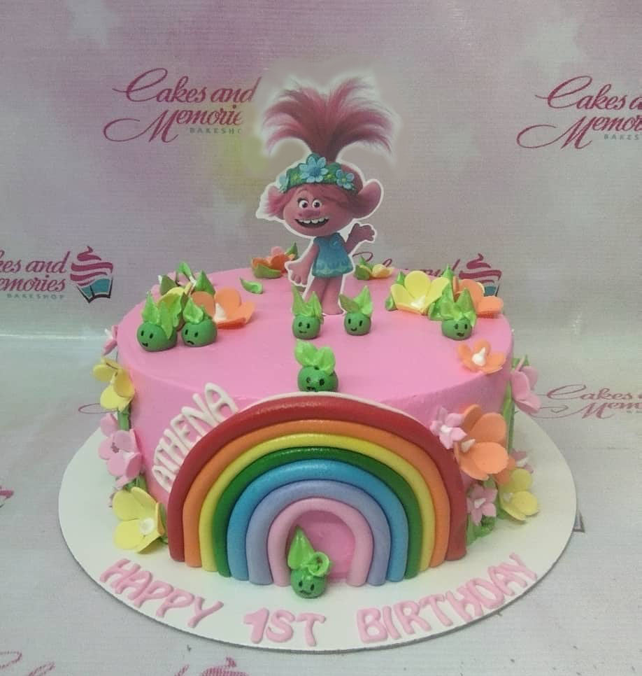 Pink Trolls themed birthday cake with a large Poppy printout topper, a colorful fondant rainbow, and small green sprout figures.