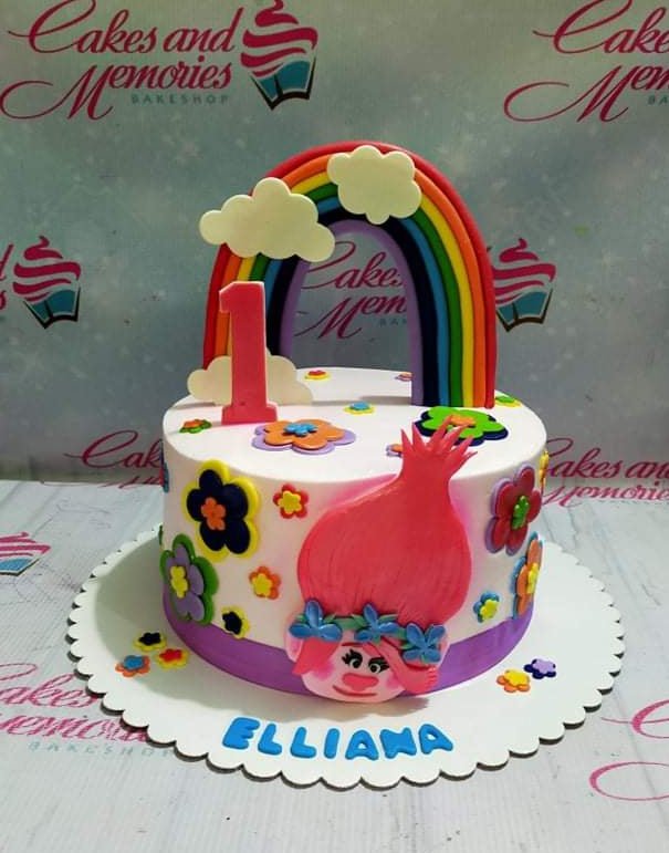 Trolls themed birthday cake featuring Poppy, a large rainbow, and colorful fondant flowers on white icing.