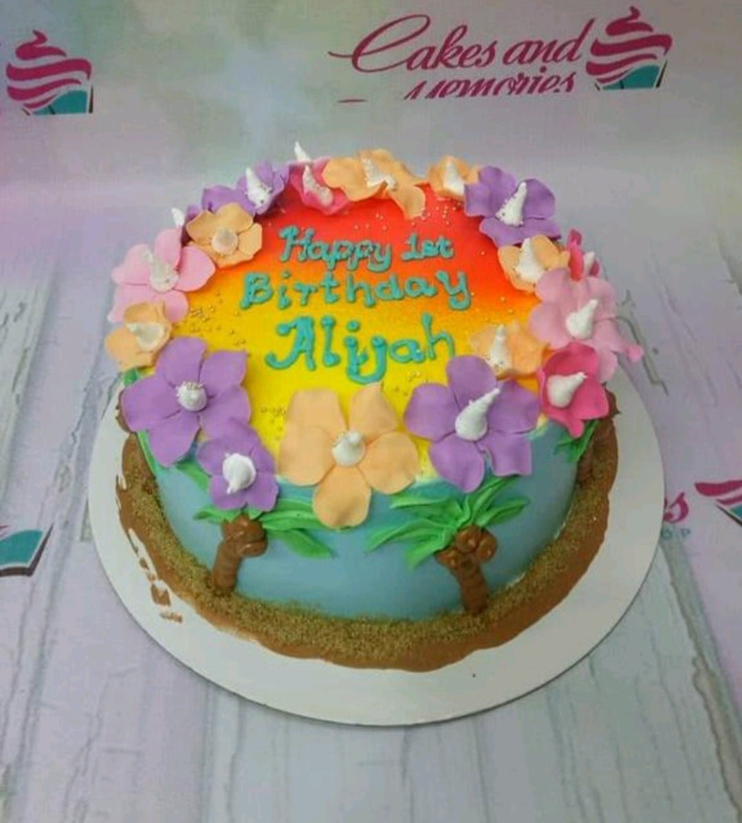 Tropical beach themed birthday cake with rainbow sunset icing, hibiscus flowers, palm trees, and a sand-textured base.