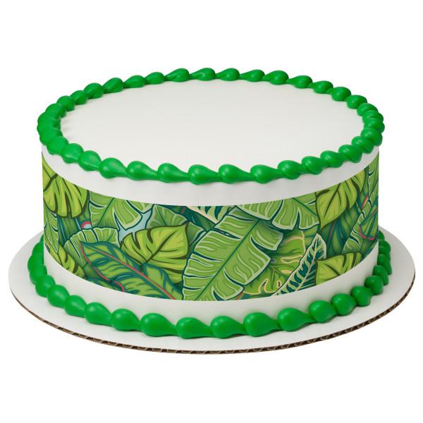 White round cake with green tropical leaf side wrap and green icing borders on top and base.