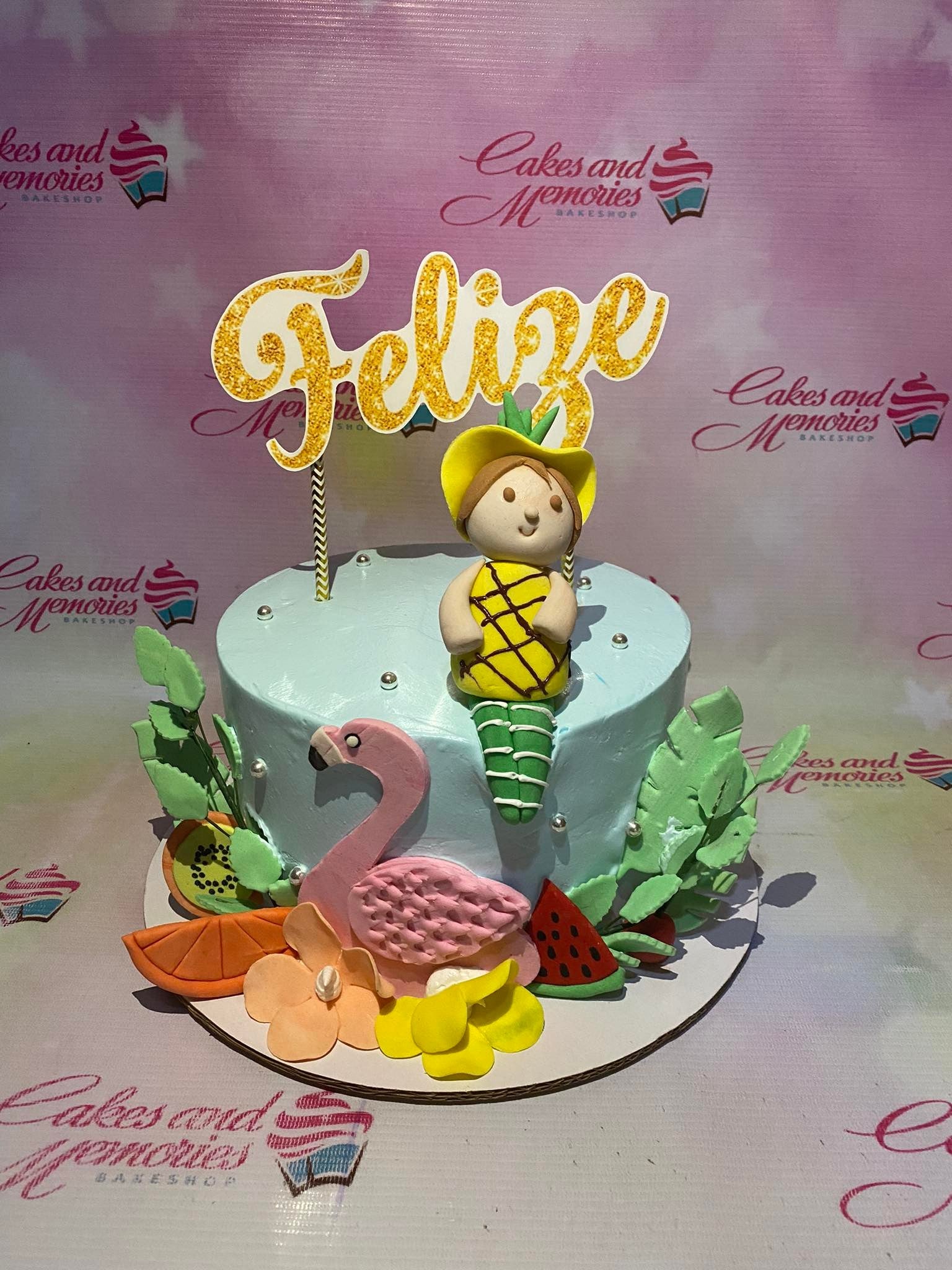 Light blue tropical themed cake with a fondant girl in a pineapple outfit, a pink flamingo, and various fruit slices.
