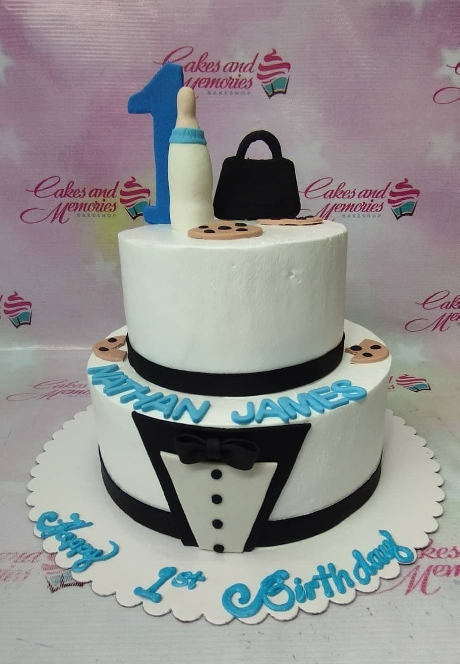 Two-tier white soft-icing cake with a tuxedo design on the bottom tier and blue baby-themed toppers on top.