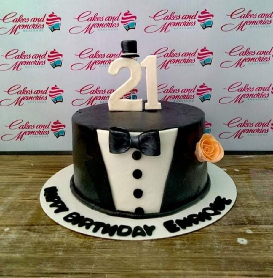 Black and white tuxedo themed birthday cake with a white number 21 topper and a small top hat.