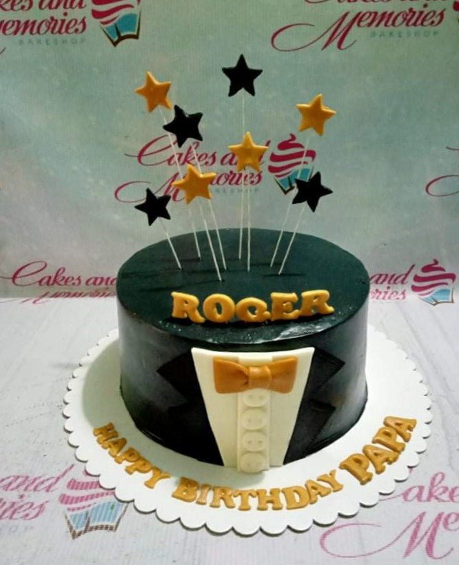 Black tuxedo themed birthday cake with gold bow tie and star toppers for Papa Roger.