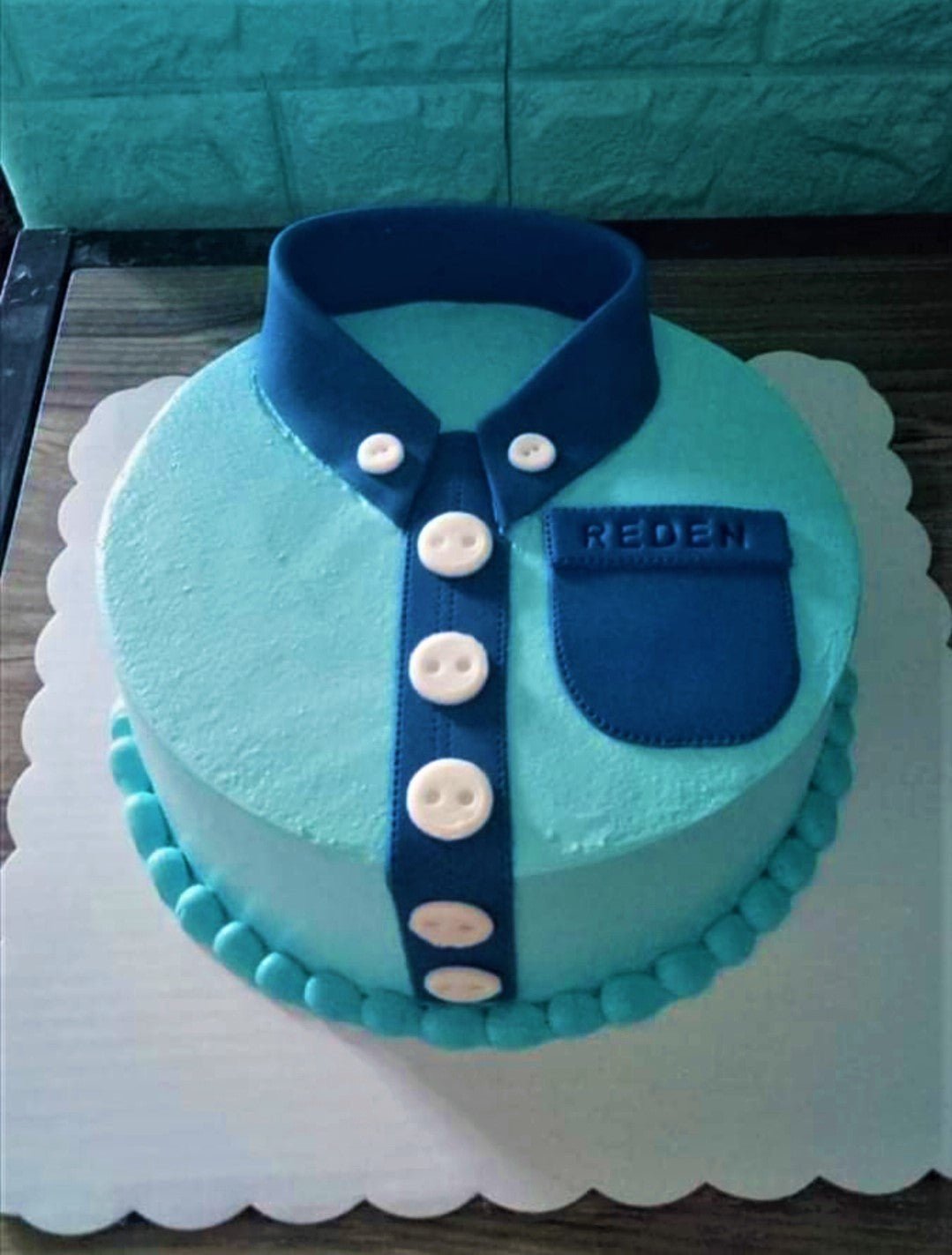 Light blue tuxedo shirt cake with dark blue collar, pocket, and white fondant buttons.