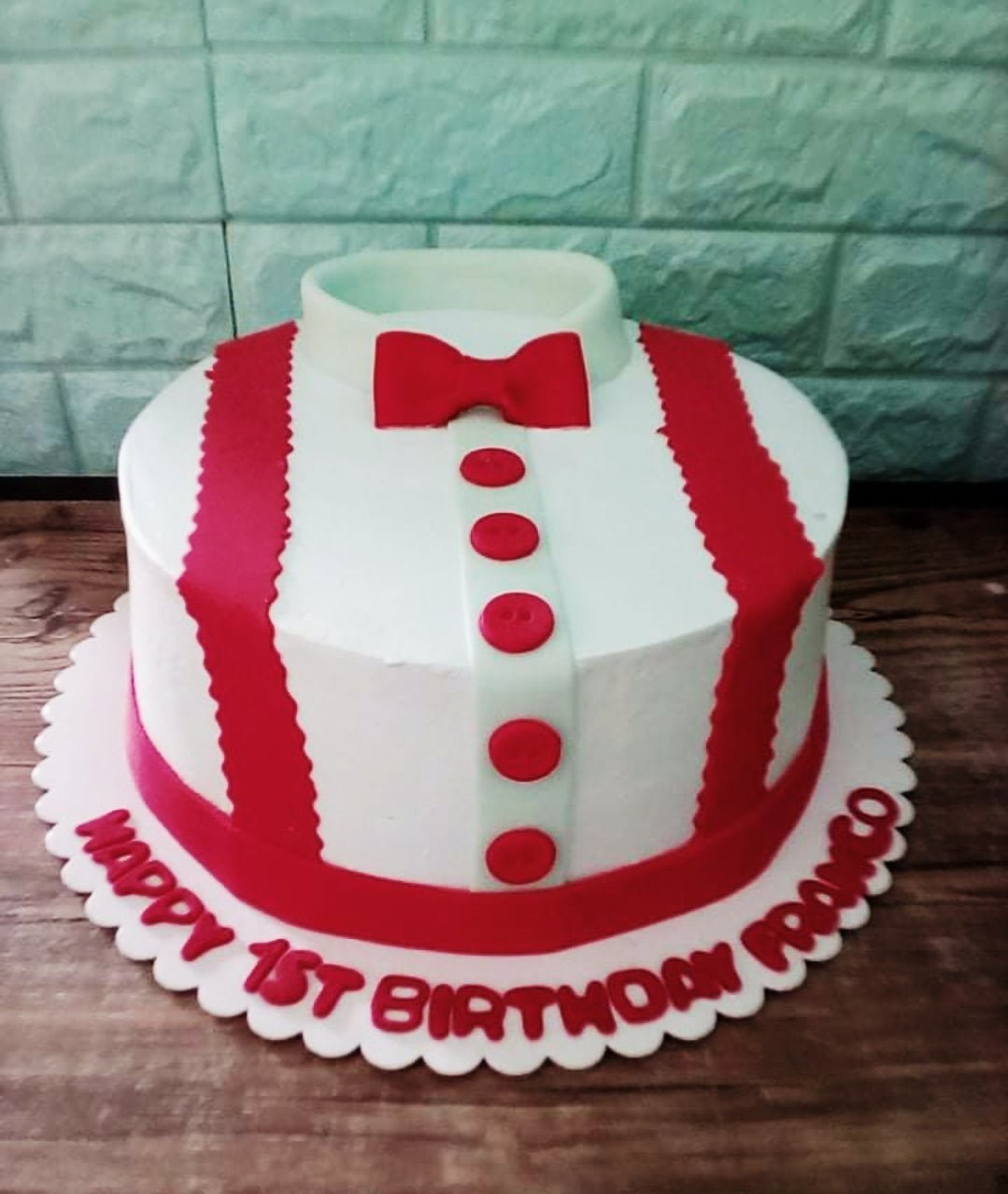 White fondant tuxedo cake with red suspenders, a red bow tie, and red buttons for a 1st birthday celebration.