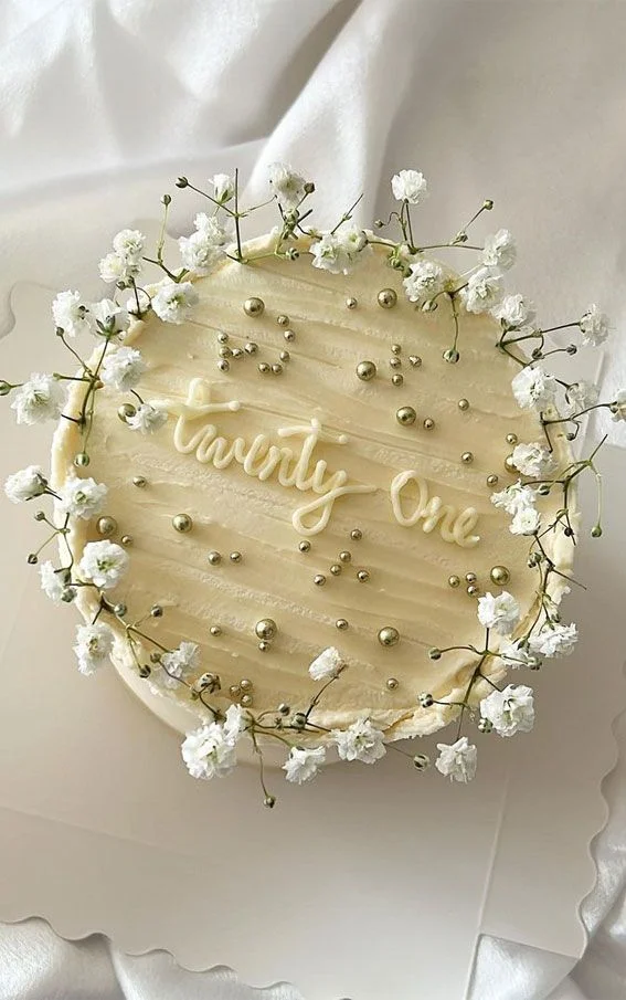 Elegant white minimalist cake with fresh baby's breath flowers, gold dragees, and 'Twenty One' piped icing message.