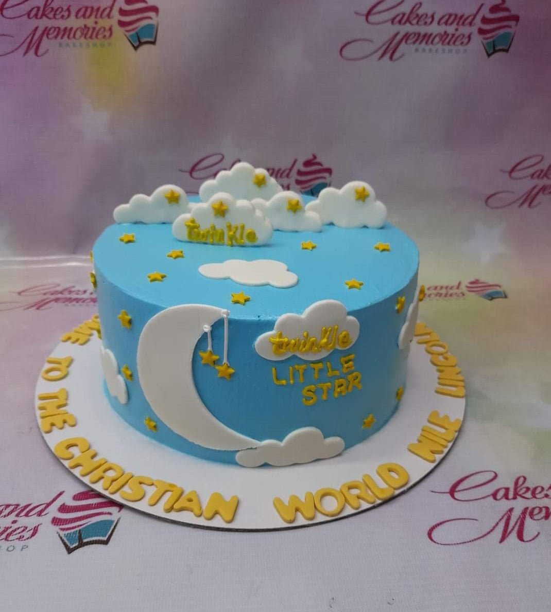 Light blue Twinkle Twinkle Little Star themed cake with white fondant clouds, yellow stars, and a large white crescent moon.
