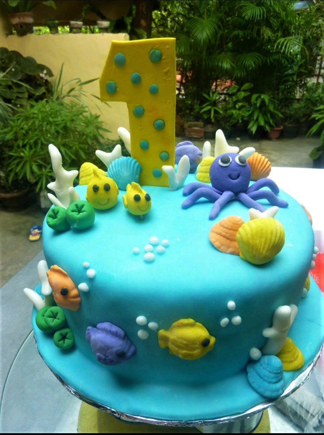 Under the sea themed blue fondant cake with an octopus, fish, shells, and a large yellow number one topper.