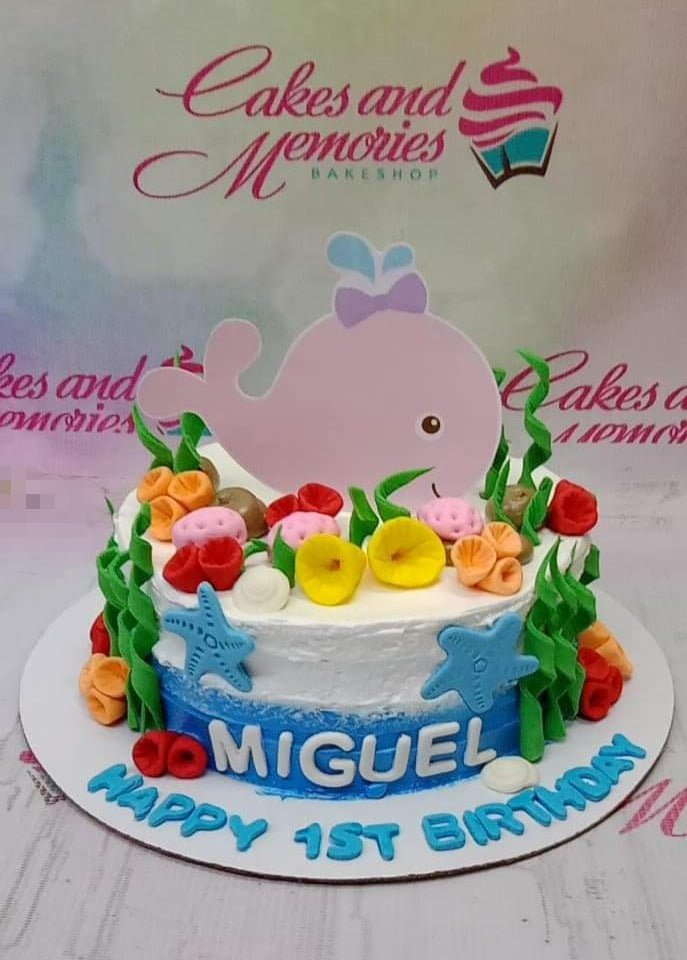 Under the sea themed birthday cake with a pink whale printout topper, fondant seaweeds, corals, and starfish on white and blue icing.