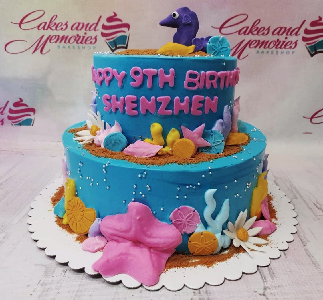 Two-tier blue underwater themed birthday cake with pink and yellow fondant sea creatures and silver sprinkles.