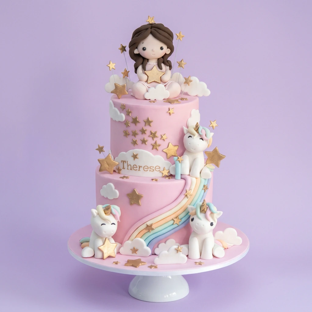Two-tier pink fondant cake featuring a girl figurine, unicorns, rainbows, and gold stars for a birthday celebration.
