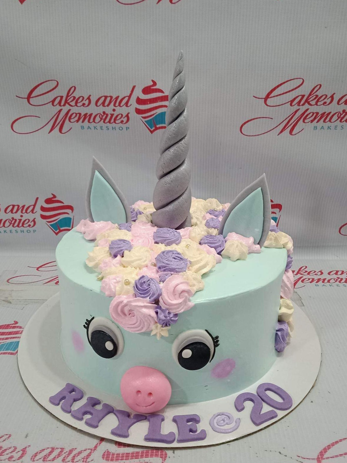 Light blue unicorn-themed cake with a silver horn, ears, and colorful icing rosettes for a 20th birthday celebration.