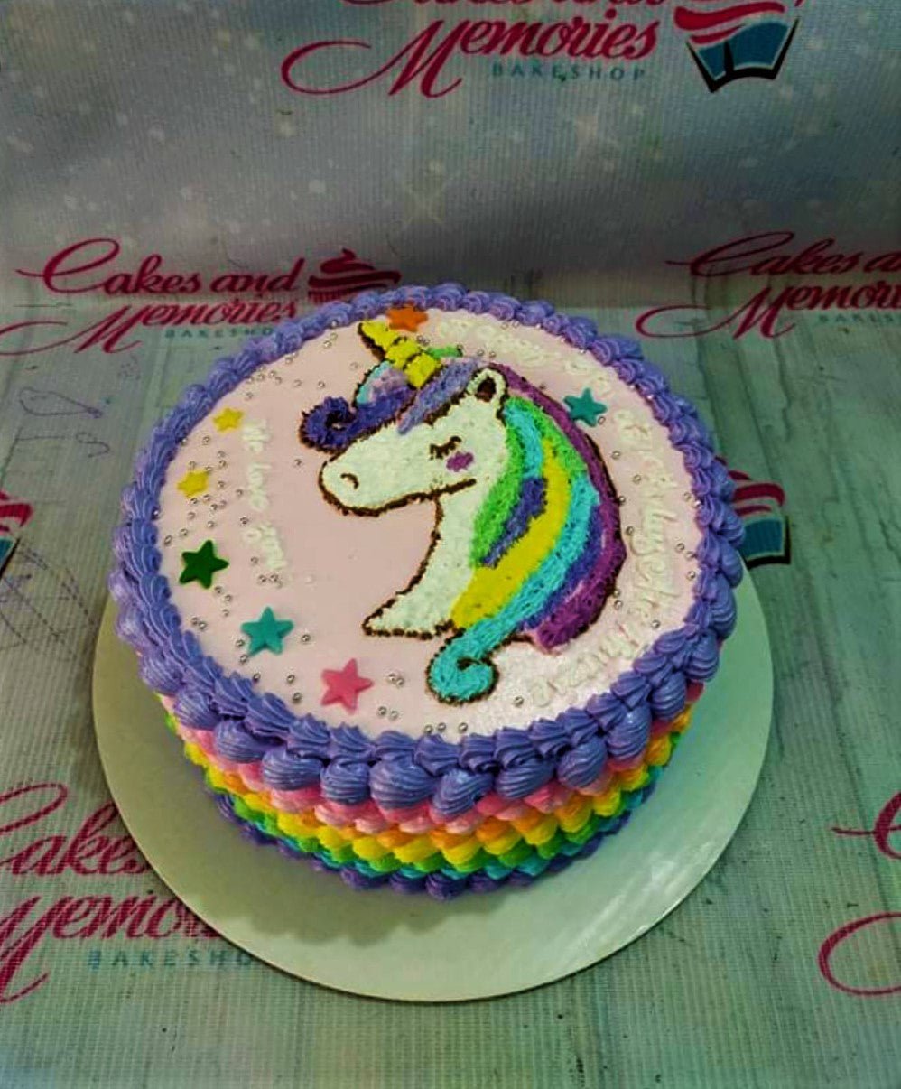Round pink unicorn cake with rainbow shell border and a large piped icing unicorn face in the center.