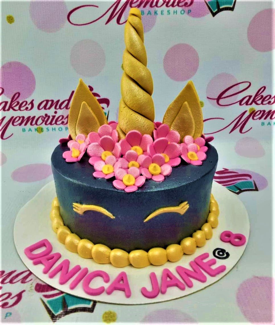 Navy blue unicorn cake with a gold horn, ears, and pink fondant flowers, featuring a personalized name on the base board.