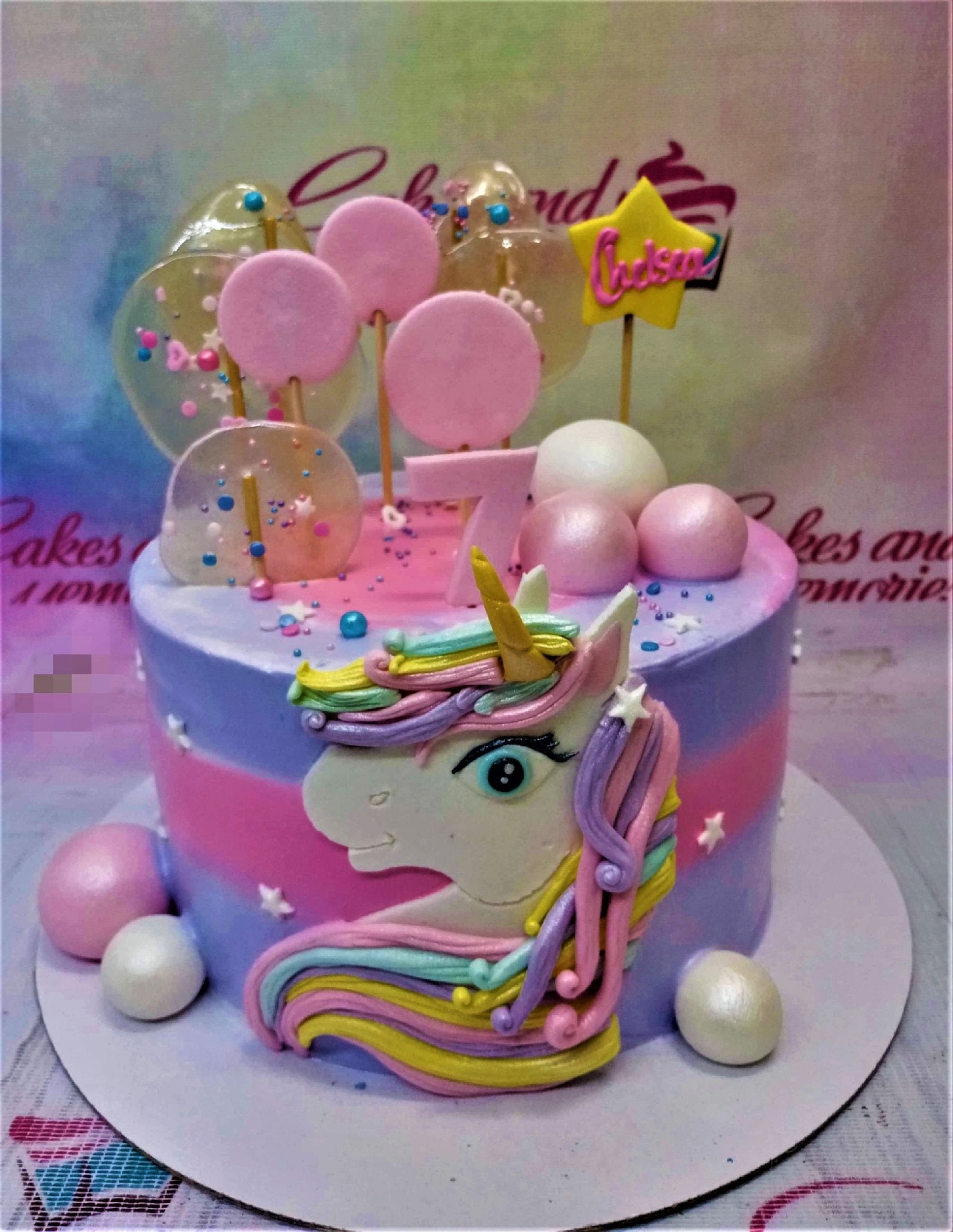 A colorful unicorn-themed birthday cake with a 2D fondant unicorn face, pink lollipops, and a yellow star topper for Chelsea's 7th birthday.