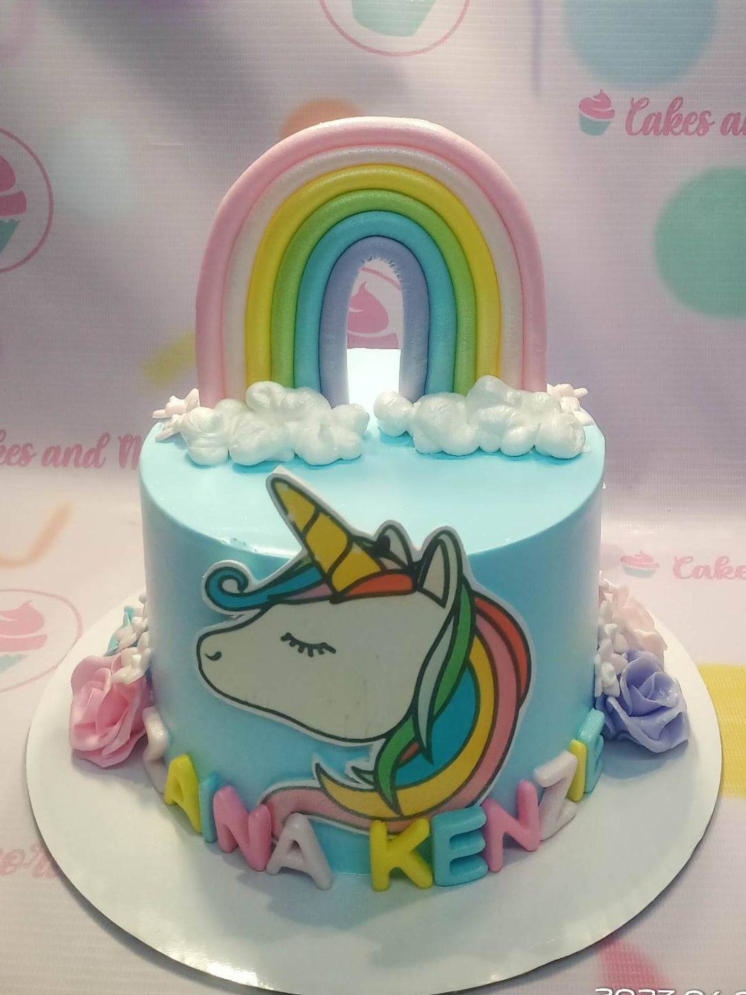 Light blue unicorn birthday cake with a large fondant rainbow, white clouds, and a printed unicorn character on the side.