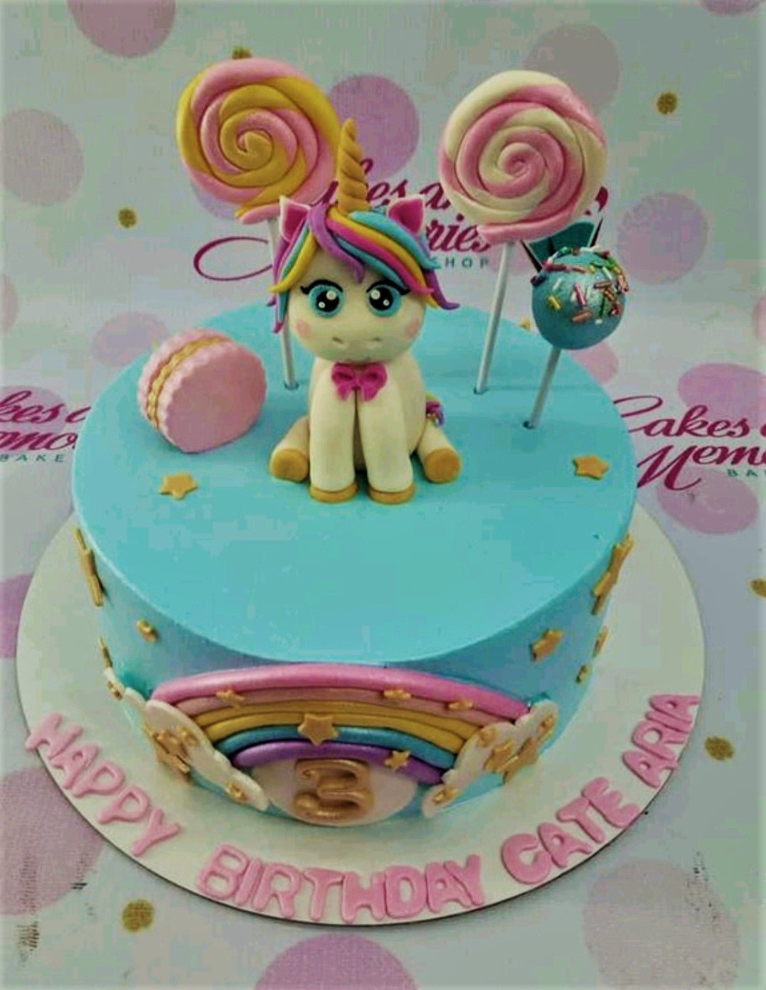Light blue unicorn birthday cake with a fondant unicorn topper, lollipops, a macaron, and a rainbow on the side.