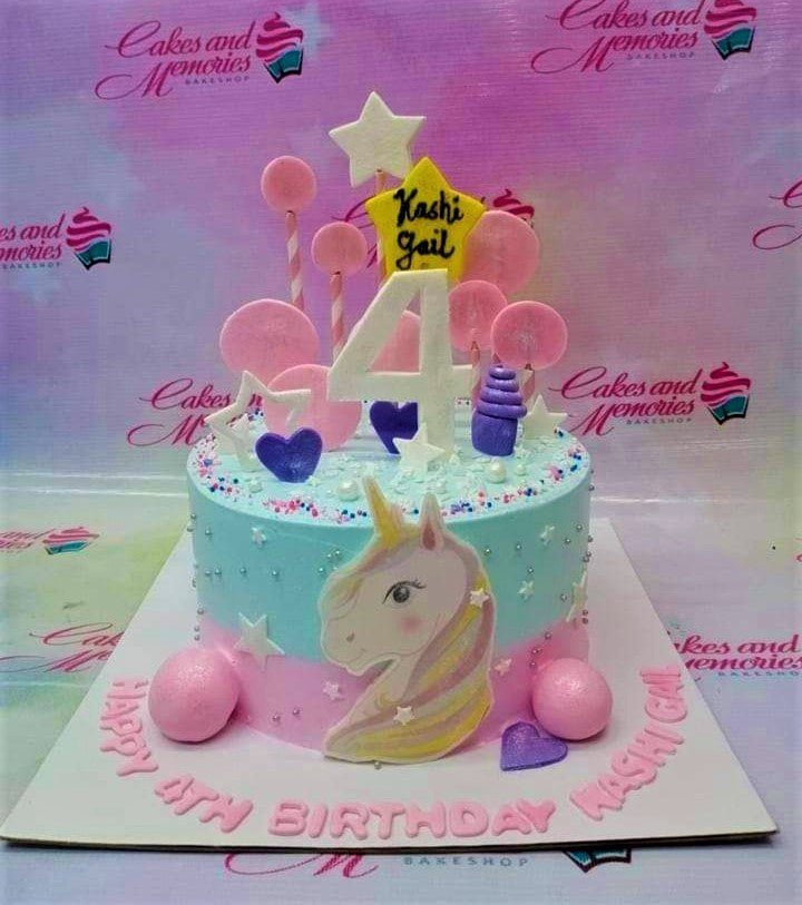 Light blue and pink unicorn birthday cake with a large number 4 topper, pink lollipops, and stars.