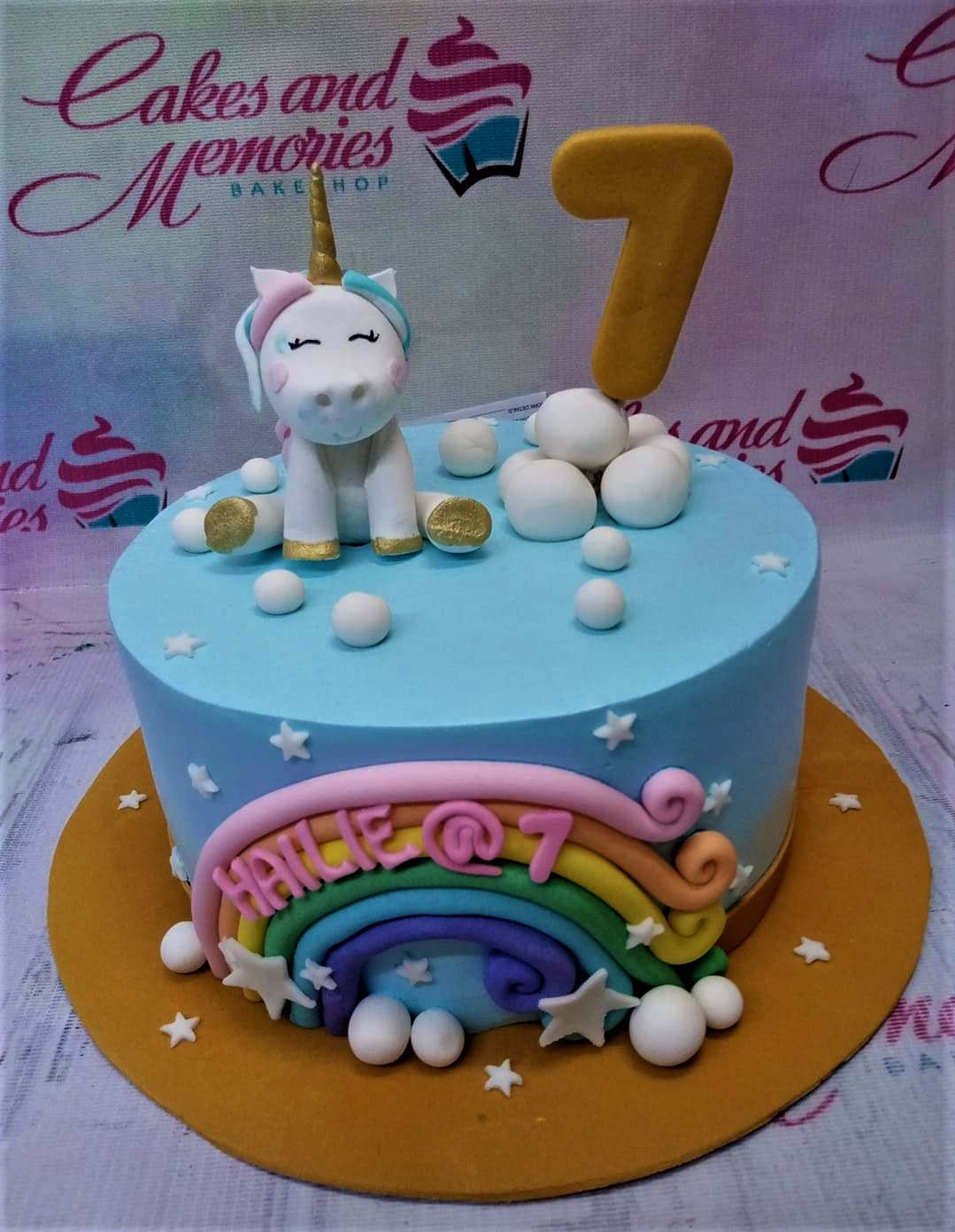 Light blue fondant unicorn cake with a 3D unicorn figure, a gold number 7 topper, and a colorful fondant rainbow on the side.