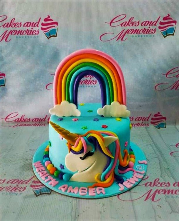 Blue fondant unicorn cake with a large 3D rainbow topper, fondant clouds, and a colorful unicorn face on the side.