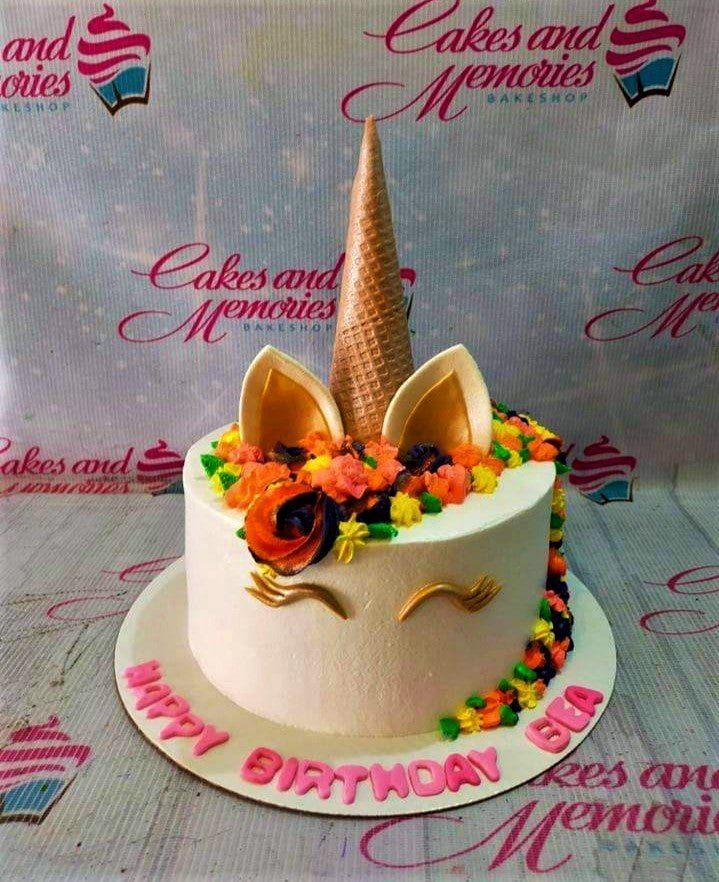 White unicorn birthday cake with a waffle cone horn, fondant ears, and colorful icing rosettes for Bea's birthday.