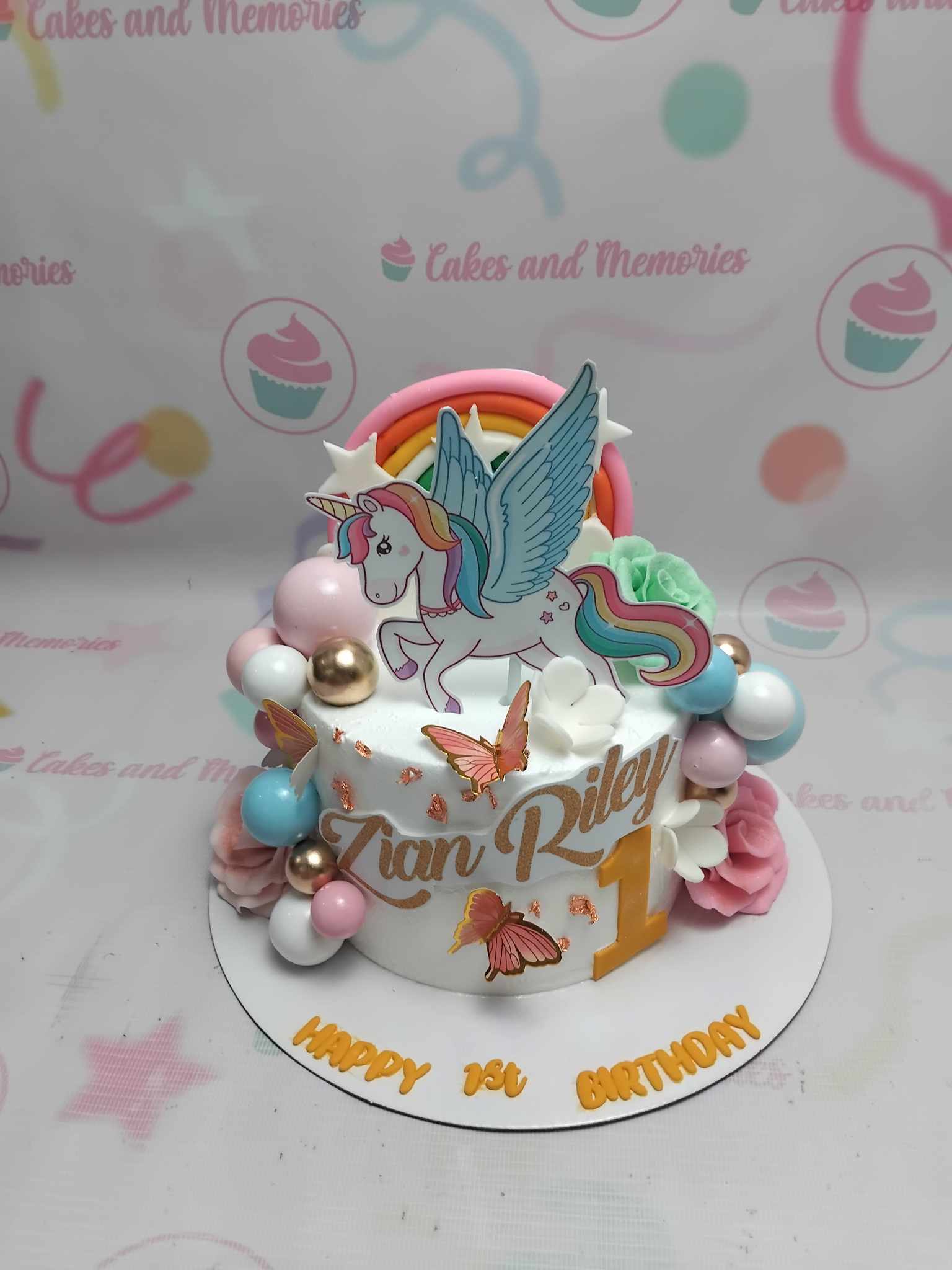 White 1-tier unicorn birthday cake with a large winged unicorn printout, rainbow topper, and pink and blue plastic balls.