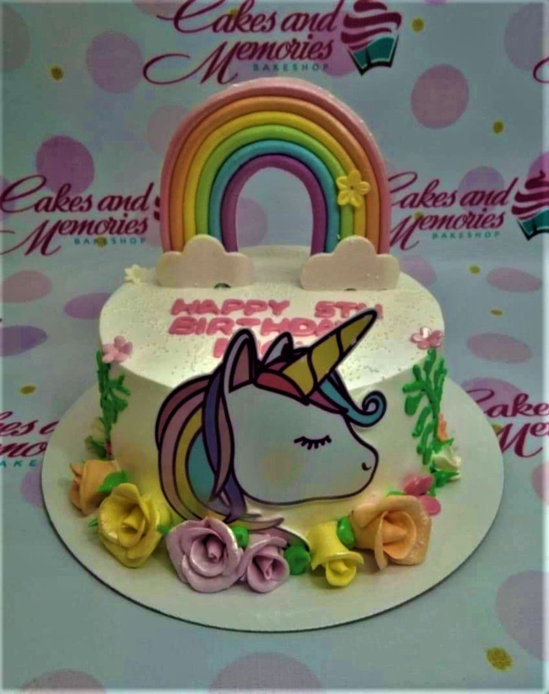 White unicorn birthday cake with a large rainbow topper, pink icing message, and colorful fondant roses at the base.