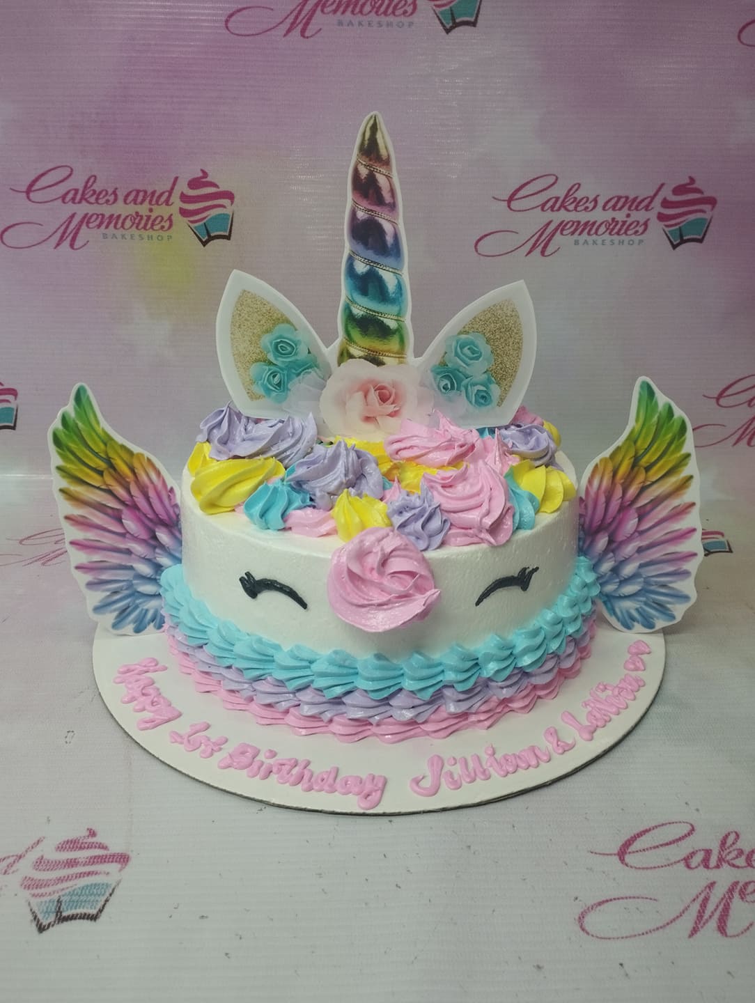 White unicorn cake with colorful icing mane in pink, purple, yellow, and blue with printed unicorn horn and wings.
