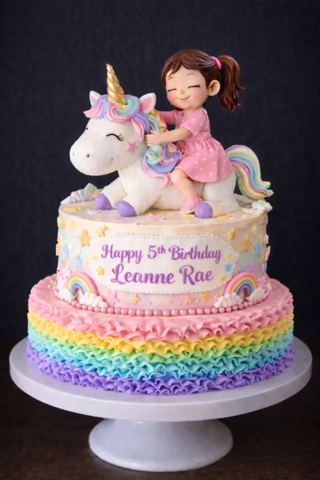 Two-tier rainbow ruffle cake with a 3D fondant girl riding a unicorn topper and pastel star decorations.