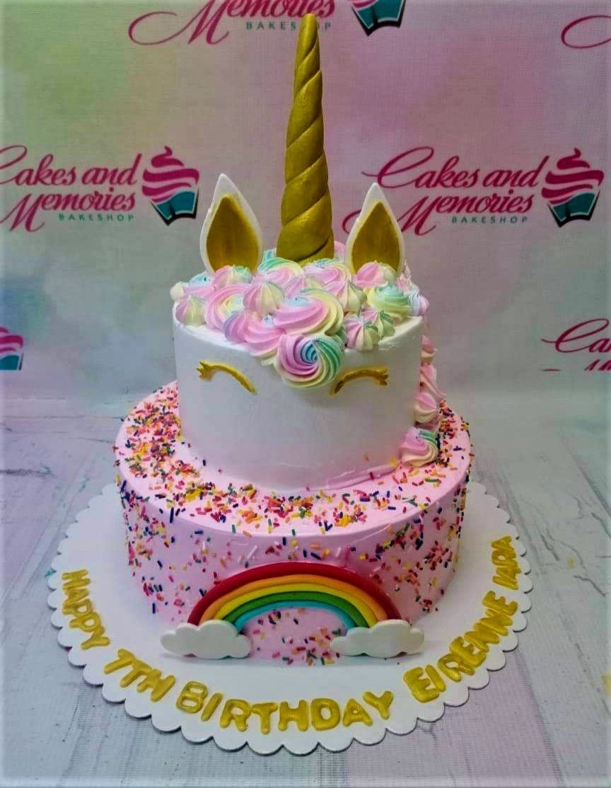 Two-tier unicorn birthday cake with pink and white icing, rainbow swirls, a gold horn, and a fondant rainbow on the base.