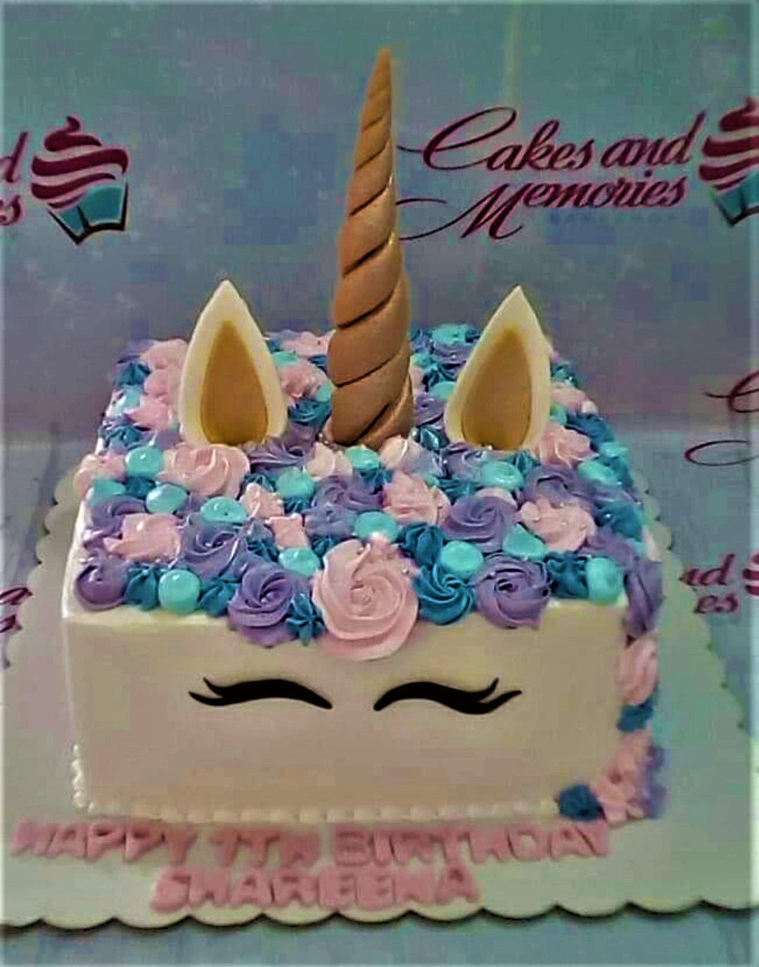 Square white unicorn cake with a gold horn, ears, and a colorful mane of pink, purple, and teal icing rosettes.