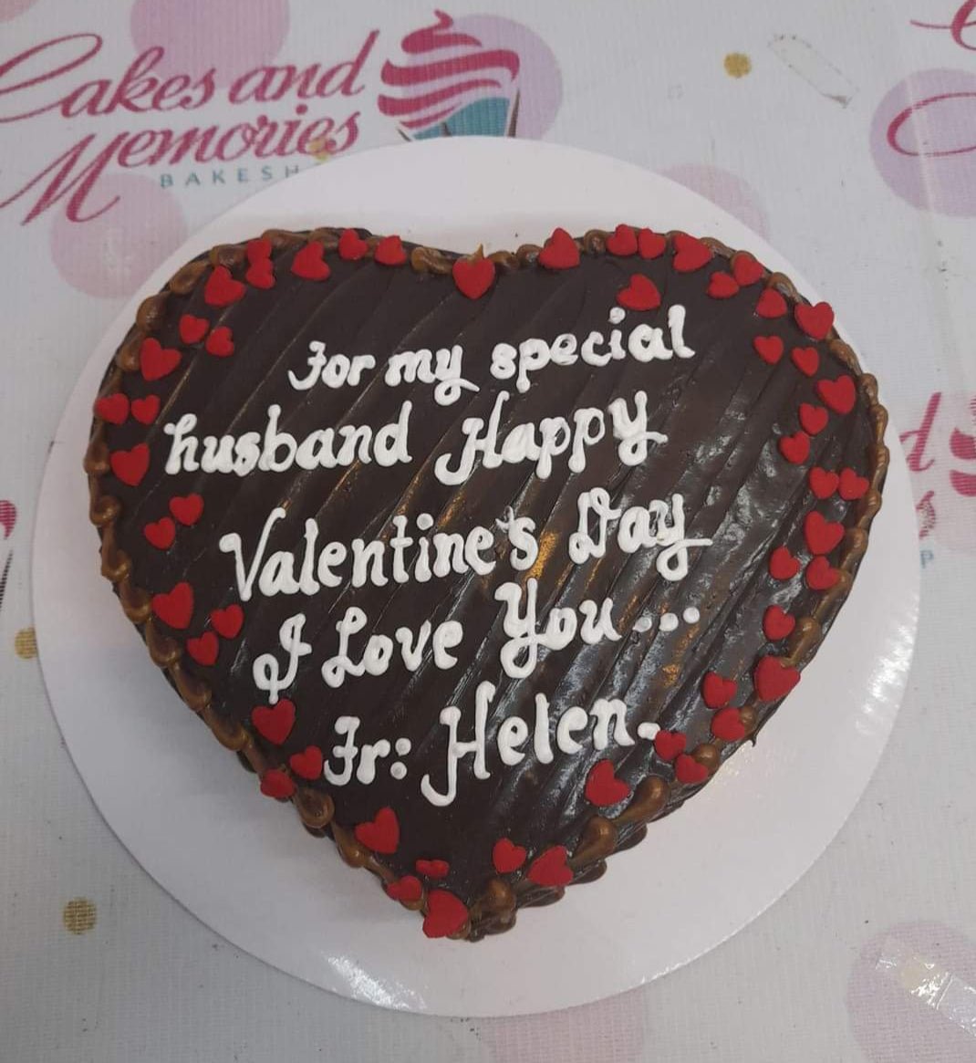 Heart-shaped chocolate cake with red heart decorations and white icing message for a husband's Valentine's Day.