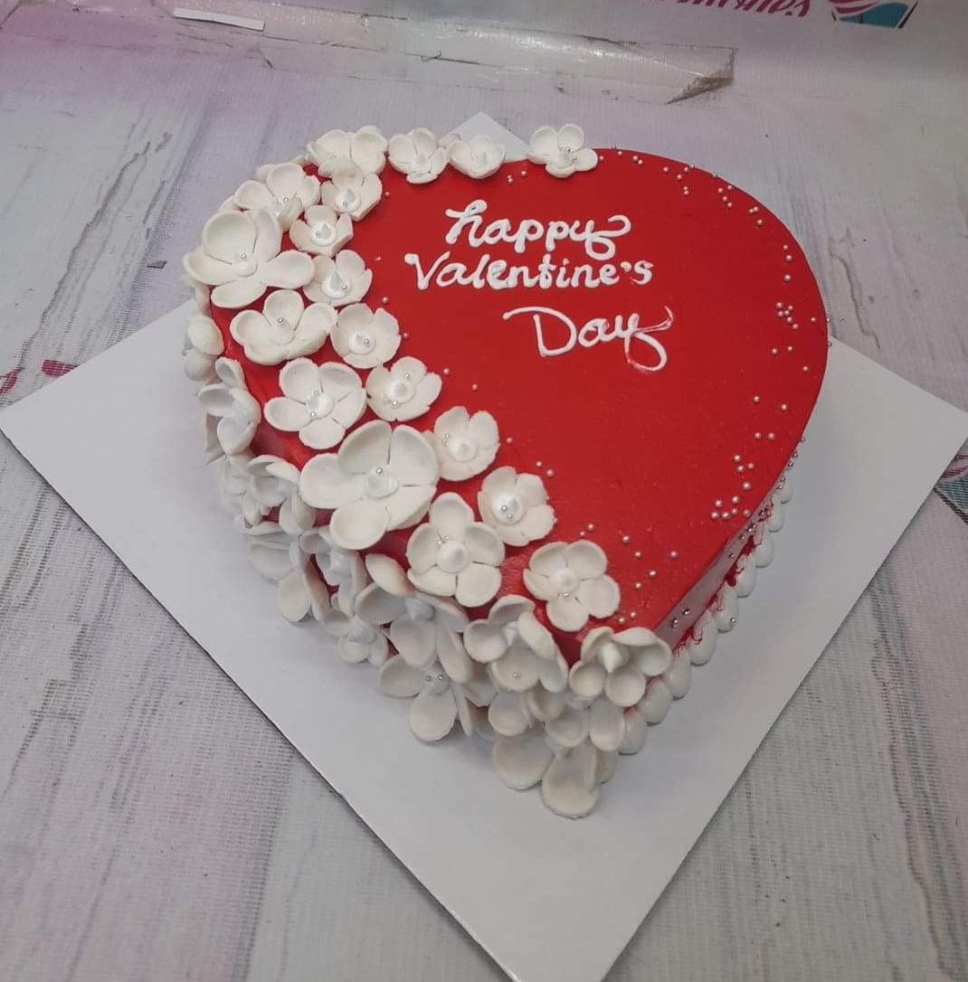 Heart-shaped red Valentine's Day cake decorated with white gumpaste flowers and silver pearls.