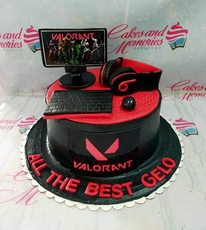 Black and red Valorant themed cake with fondant gaming peripherals including a monitor, keyboard, mouse, and headset.