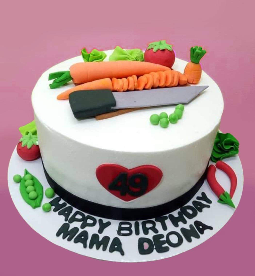 White 1-tier vegetable themed birthday cake with fondant carrots, tomatoes, peas, and a chef knife topper.