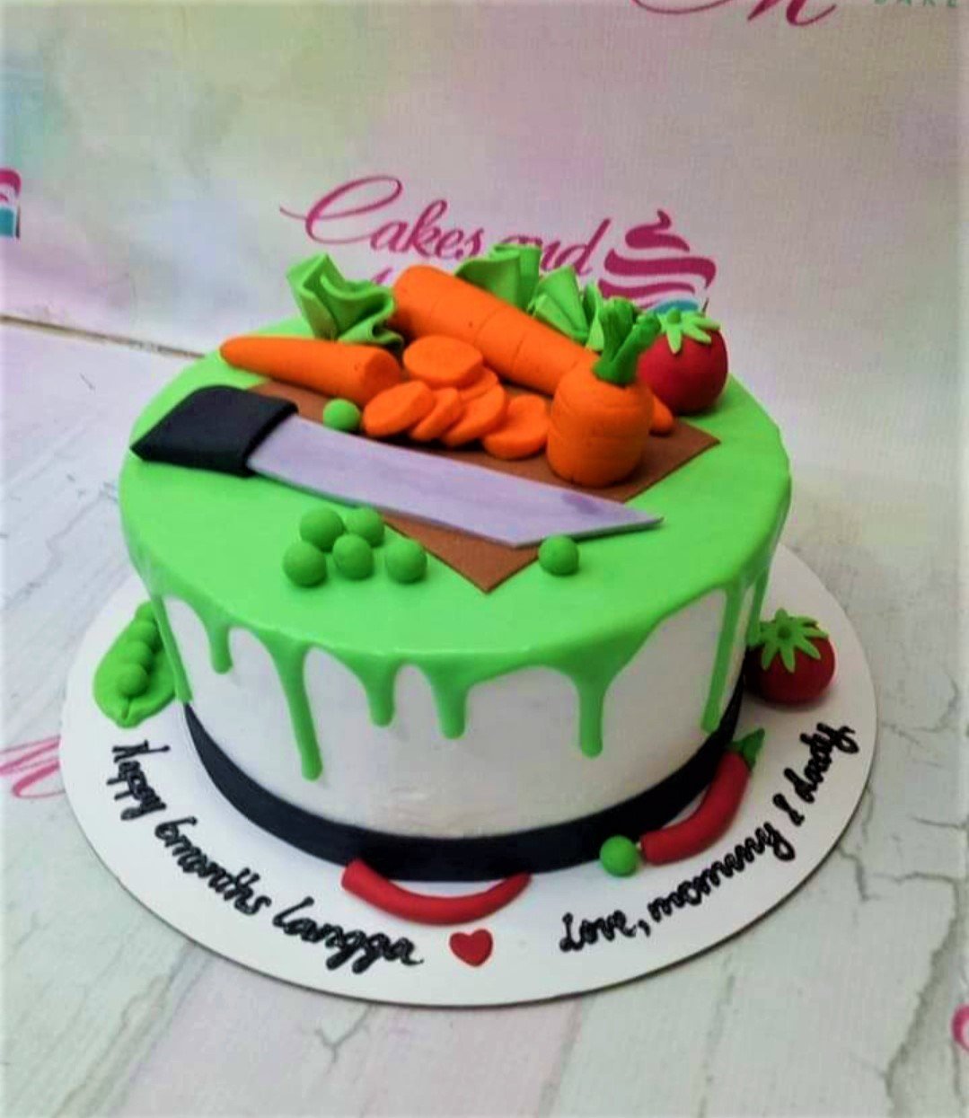 Vegetable garden themed cake with fondant carrots, tomatoes, peas, and a chef knife on a green drip icing base.