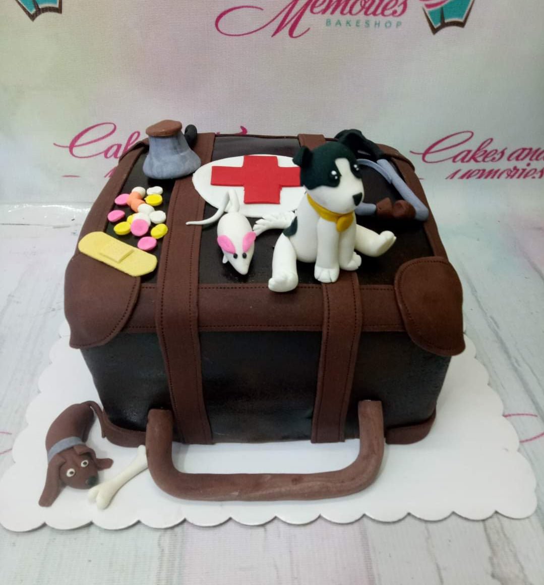 Veterinary themed suitcase cake with fondant dog, mouse, stethoscope, and medical supplies on a brown fondant base.