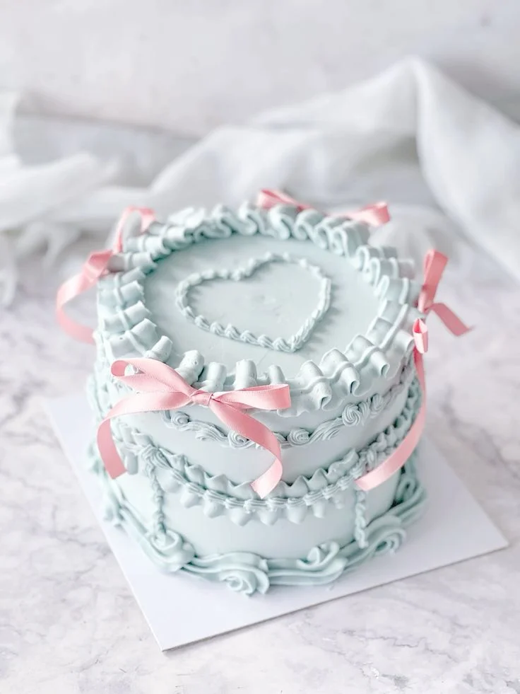 Light blue vintage heart cake with intricate ruffles, pink satin bows, and a piped icing heart on top.