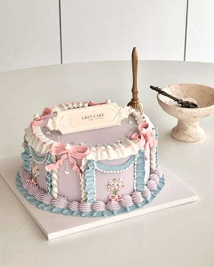 Elegant lavender vintage-style cake with intricate white and blue ruffles, pink bows, and a central rectangular plaque.